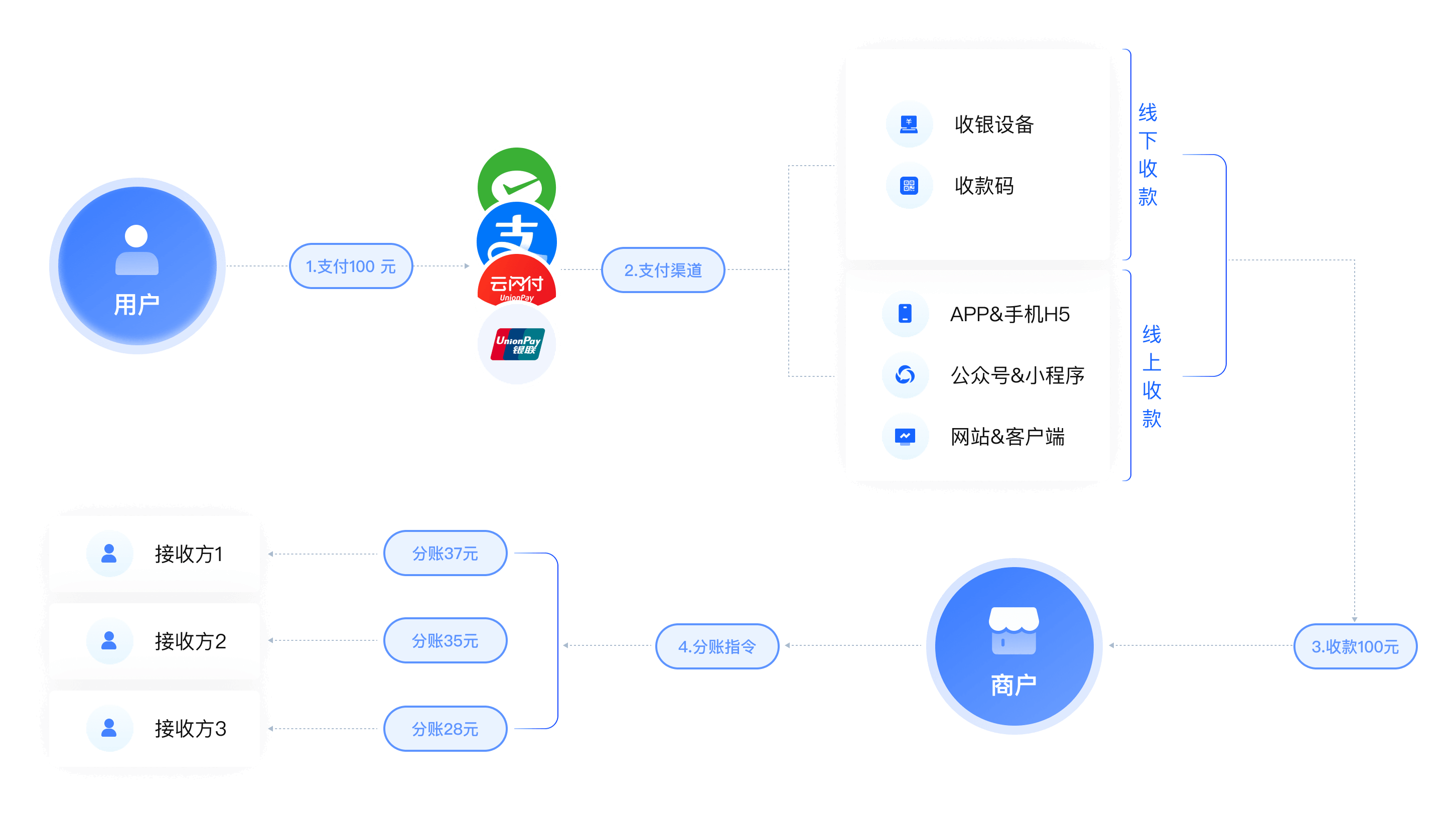 支持分账至企业、个体与个人账户,通过实时、延时、固定或按比例分