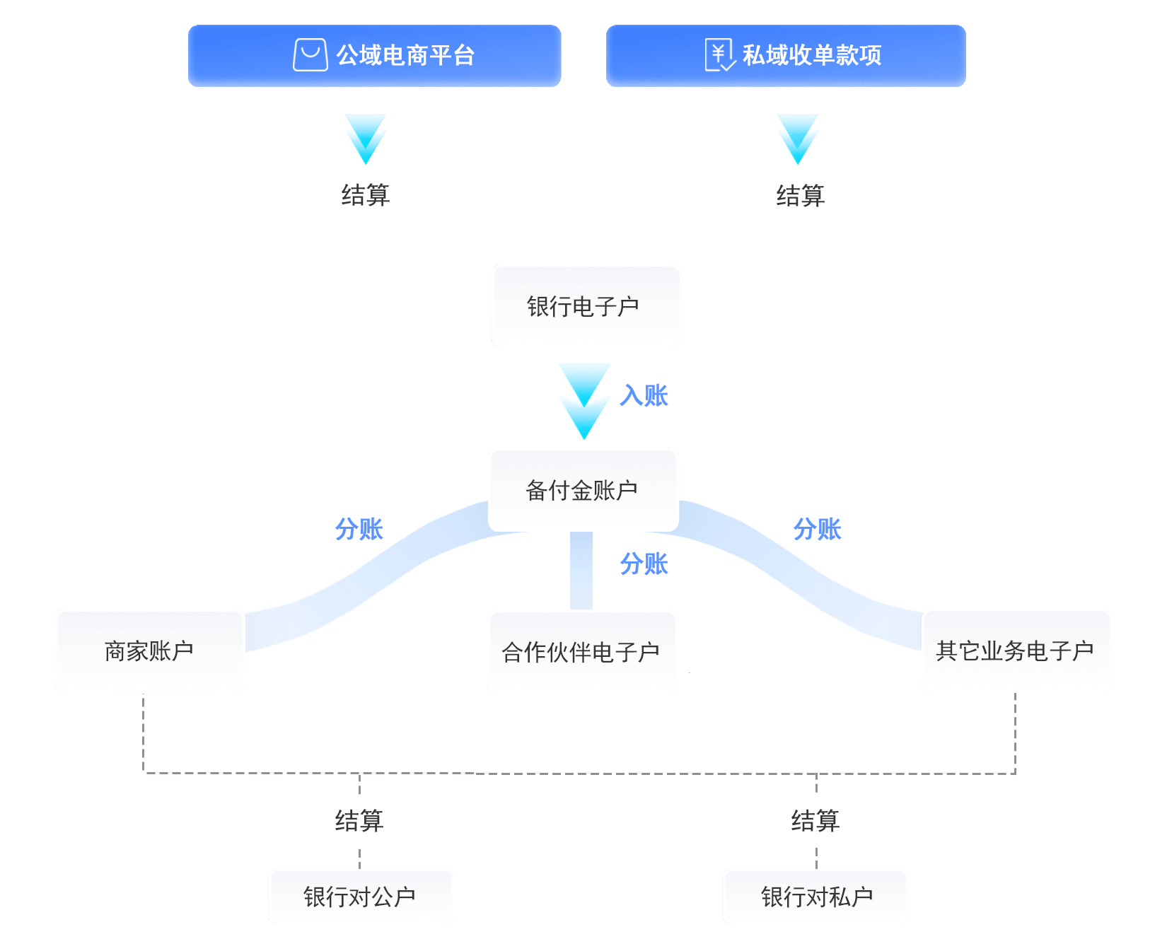 依托银行与收收单机构电子账户构建双账户架构,实现高效合规的资金清分结算体系。