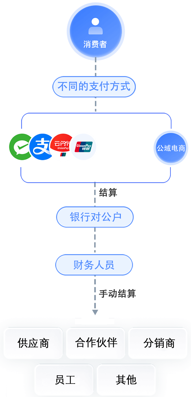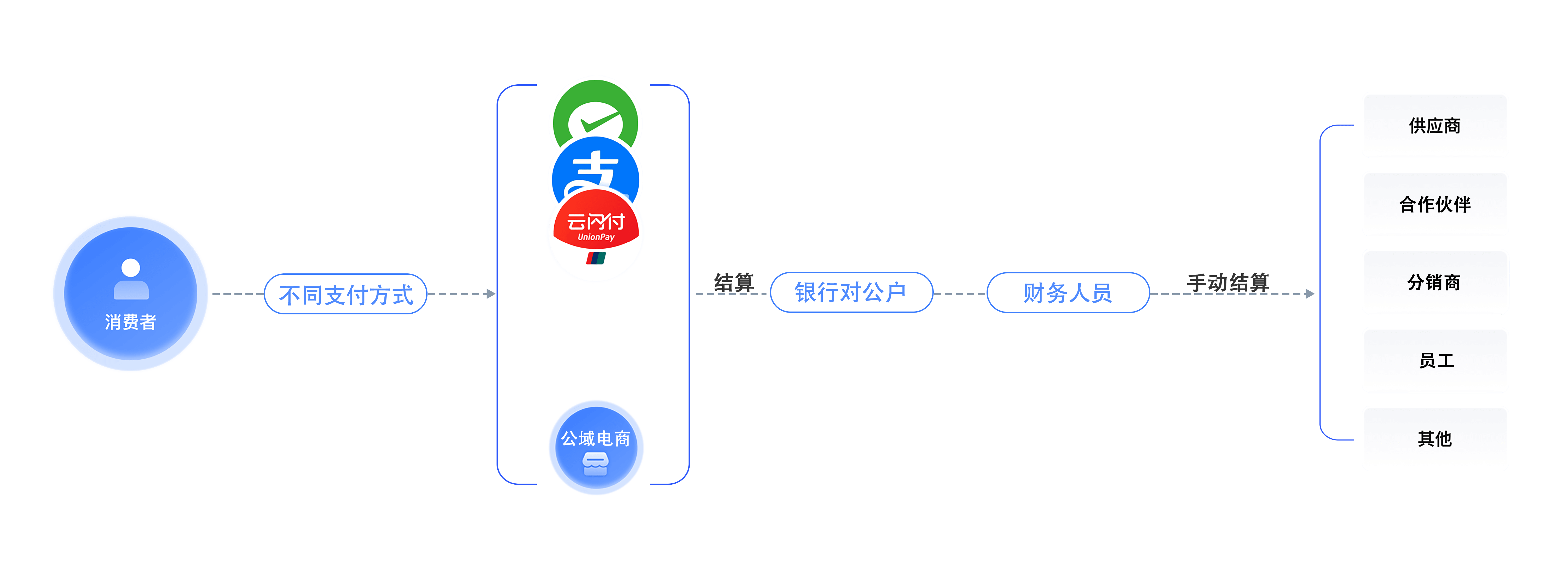 有多个平台多个网店,经营资金结算分散,需人工繁琐对账。